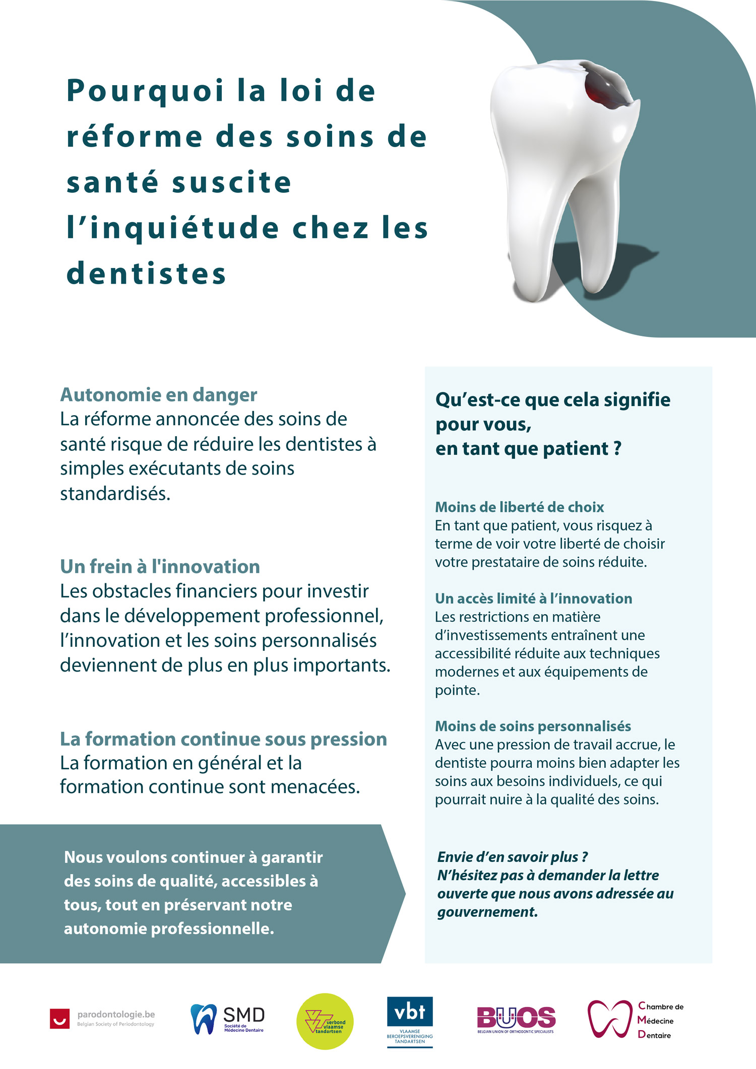 Le montant total (intervention + ticket modérateur + supplément). Votre mutualité vous rembourse le montant de l'intervention de l'INAMI. + le ticket modérateur pour les statuts BIM. Les assurances privées (Dentalia, Dento +, DKV, ...) prennent en charge les suppléments ou les soins non remboursés par l'INAMI (couronnes, bridges, ...) selon un pourcentage propre à chaque assurance.